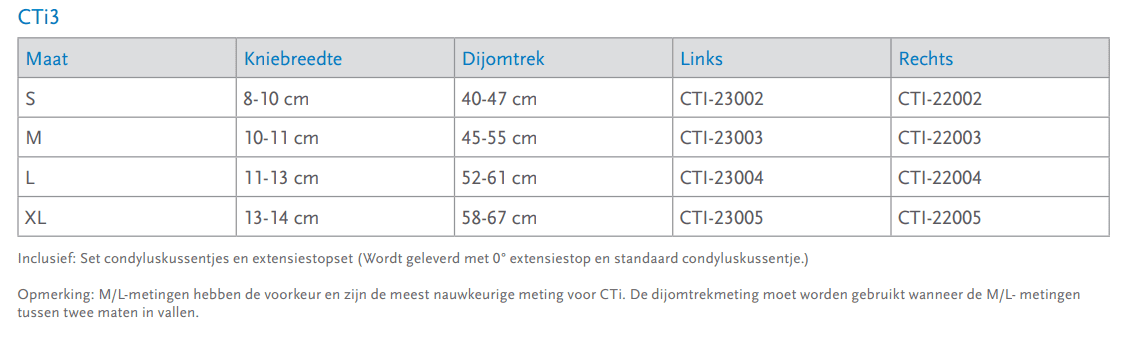 Omdat de CTi3 een ‘high performance’ Rigide kniebrace is, is het noodzakelijk om de breedtemaat van de kniebrace nauwkeurig te bepalen. Hiervoor kan een grote schuifmaat of een boek/blokhaak gebruikt worden. In onderstaande video wordt eenvoudig en stap-voor-stap genoemd hoe de maatname in zijn werk gaat. Vervolgens kunt u in de maattabel de aanbevolen maat aflezen.